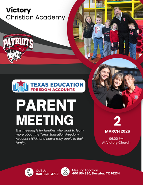 Victory Christian Academy in Decatur, Texas, is one of the fastest-growing private Christian schools in North Texas. Our purpose is to instill Christian character and values from Pre-K to 12th grade. We are fully accredited by TEA, ICAA, Cognia, and ORUEF, and we participate in sports through TAPPS. We have skilled, dedicated, caring teachers who inspire students, which ignites excellence in our academics. We have boys and girls state-winning sports teams, FFA, 4H, a flight school, and many activities to engage and benefit your students. Come be a part and put Victory in your family!