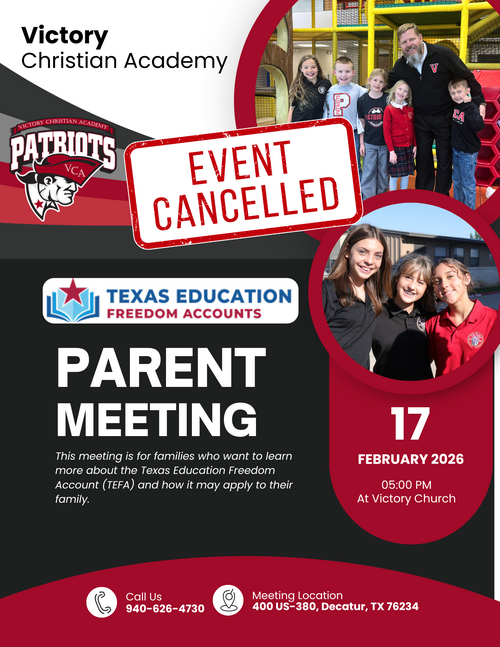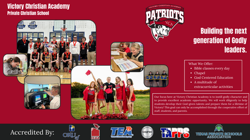 Victory Christian Academy in Decatur, Texas, is one of the fastest-growing private Christian schools in North Texas. Our purpose is to instill Christian character and values from Pre-K to 12th grade. We are fully accredited by TEA, ICAA, Cognia, and ORUEF, and we participate in sports through TAPPS. We have skilled, dedicated, caring teachers who inspire students, which ignites excellence in our academics. We have boys and girls state-winning sports teams, FFA, 4H, a flight school, and many activities to engage and benefit your students. Come be a part and put Victory in your family!